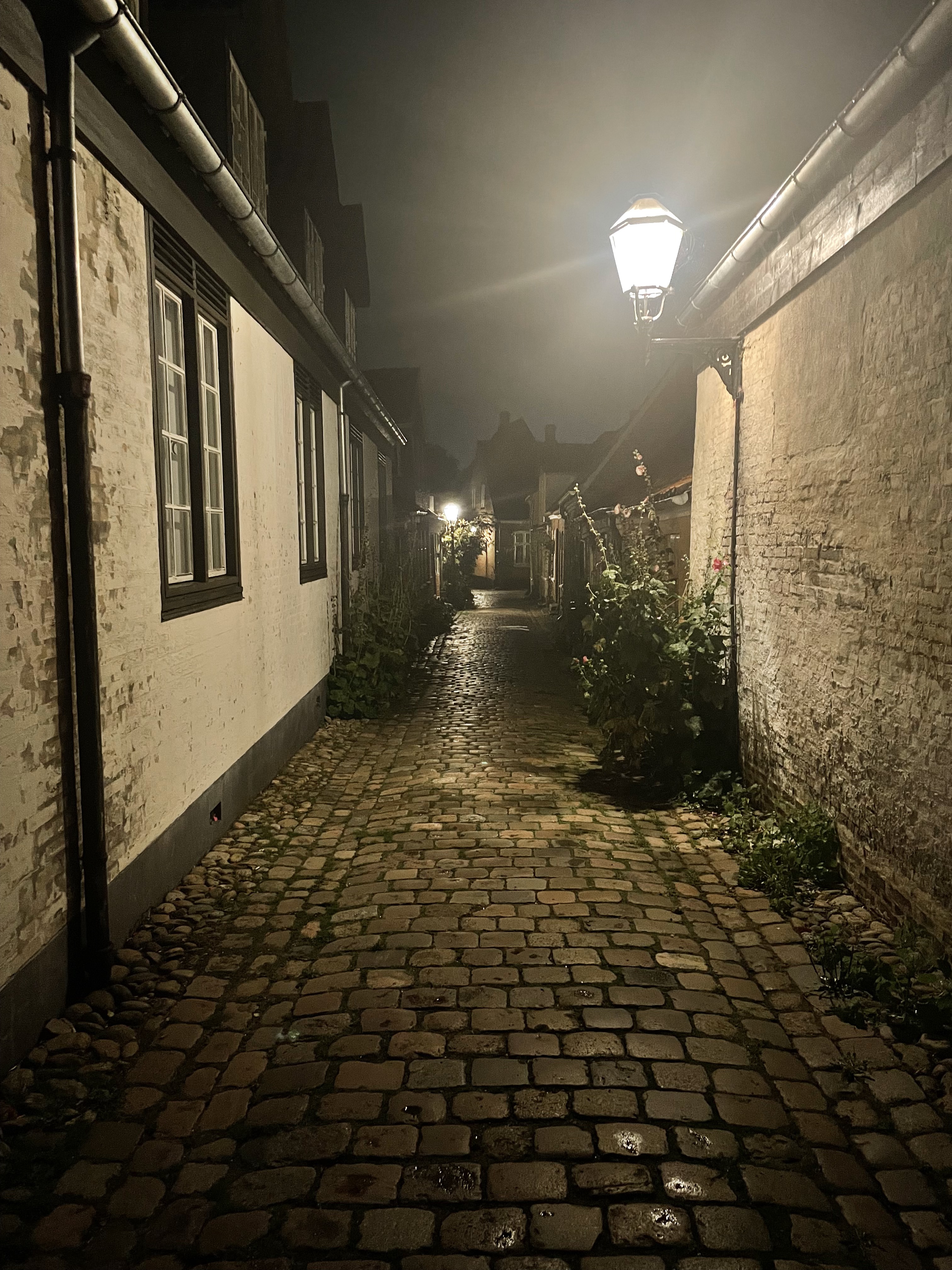 Therefore it had taken some planning and effort to reach Ribe, my destination for the night. I’d wanted to come here for some time, lured by its deep antiquity and colourful tiny houses. When making this plan I had not quite banked on Ribe being as completely dark as it turned out to be, and an inky night showed the city off in a moody, unwilling light. Ribe, presumably very jolly on a warm summer’s night was almost all shut up. No-one on reception in my hotel to say Hej or God dag or even to take my money it seems (they asked for it by email when they woke up pretty quickly) and only two places open to buy food. One was a pizza place that served a large slice of doner kebab pizza which I ate with the relish of someone who hadn’t for 9 hours. The other was a late shop that sold an ice cream for pudding and some backup breakfast for the following morning.