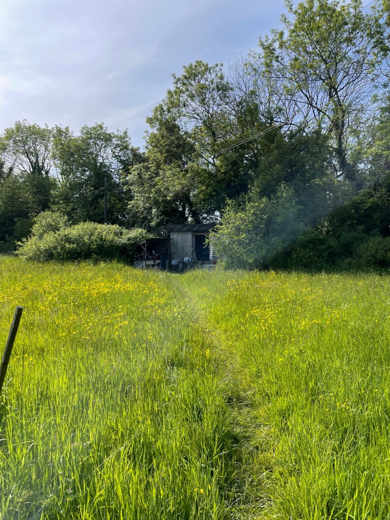 Here, like in all the daydreams I’d had about what it was like here, the sun shone gently through the trees. The breeze blew long grass around in front of me. It was a little cooler than the baking sunshine of high East Anglian summer. The owners have looked after the farm well, with creepers reaching around ancient harrows and lean-tos for drying wood. The hedges hide back-to-nature bicycle frames, cartwheels and not-sure-whats. The Maytime wildflowers are tall in the meadow by the railway wagon. We slept so well here we all overslept including Rosie the dog, who spent her time bouncing through the long grass chasing Winnie as she lapped the field and urged us into more games of hide and seek.