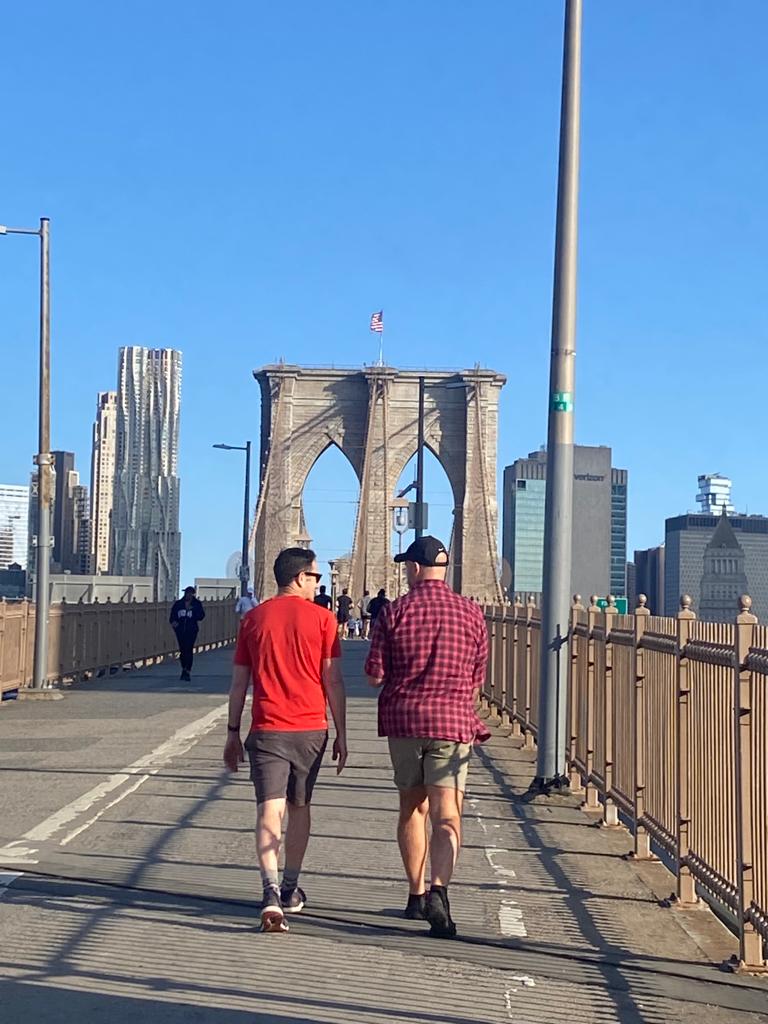 On Wednesday morning I became more of a regular member of the human race and met colleagues at 6am outside their hotel. Immediately the pace slowed, other people need tickets, need a coffee here and there, want to stop and look at things, are fun and good company. But we got over to Brooklyn Heights before 7am, to that wonderful promenade, then across the Brooklyn Bridge in the windy and cold early air. I was cold, but it was a good morning and in particular I felt good at helping other people, though I’m not sure how much they needed it.