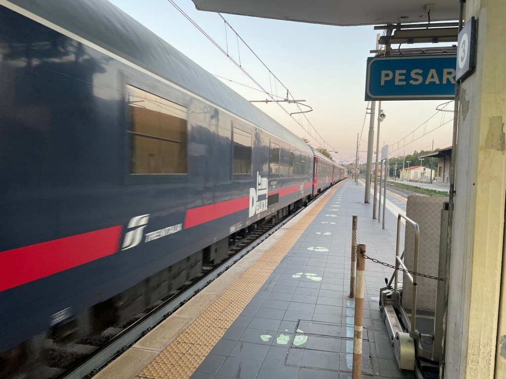 It’s 5.44am on a summer’s Sunday morning on platform 3 of Pesaro’s railway station. A thrilling sight comes into view – a seemingly late-running Treno Notte, thundering off north to Bologna. A few minutes later my train – the first, fast Fresciarossa or ‘Red Arrow’ – pulls in. I leave behind the work appointment that brought me to the Italian seaside on a warm, humid weekend and settle down for the journey north to Milan and beyond.