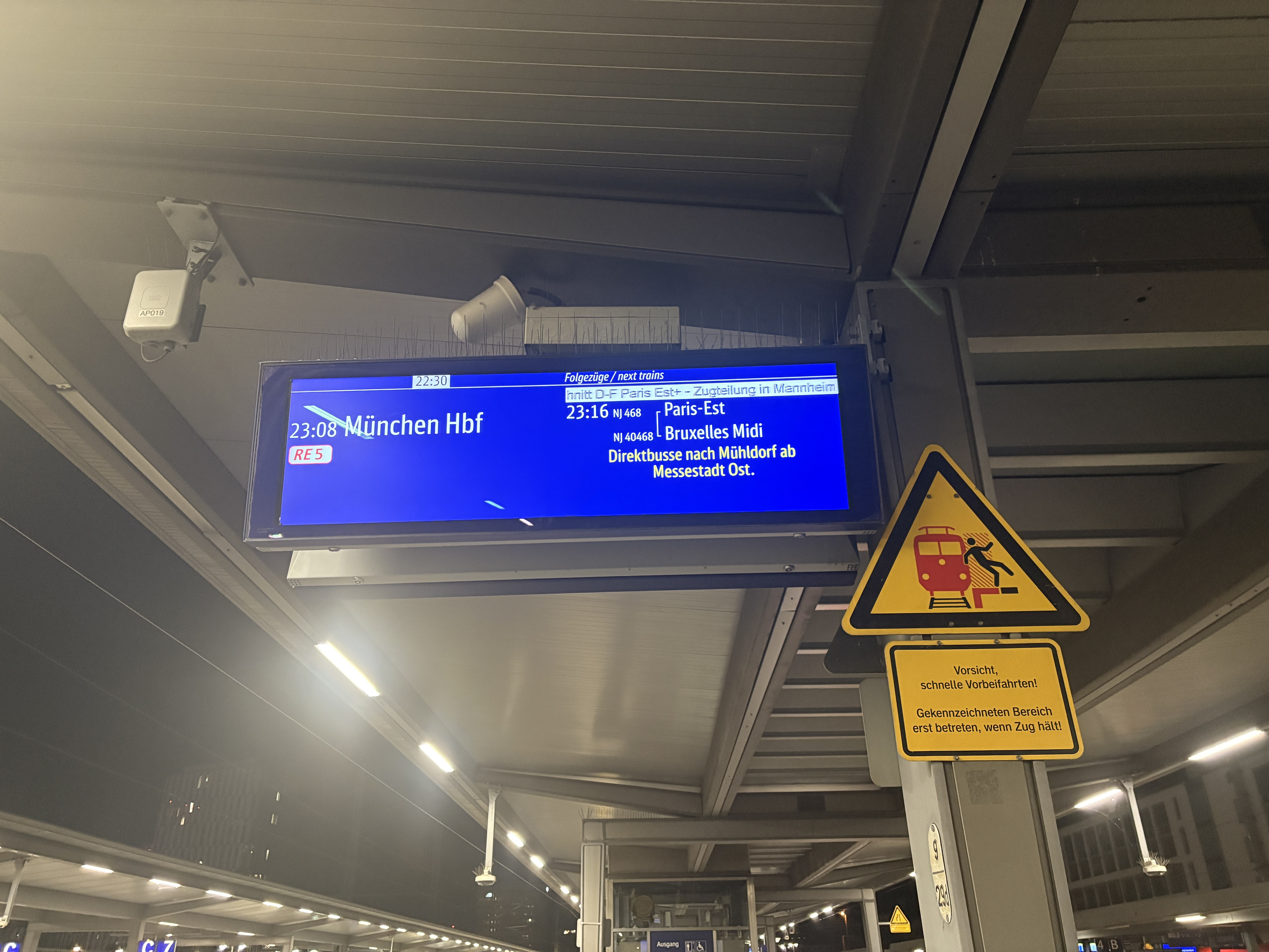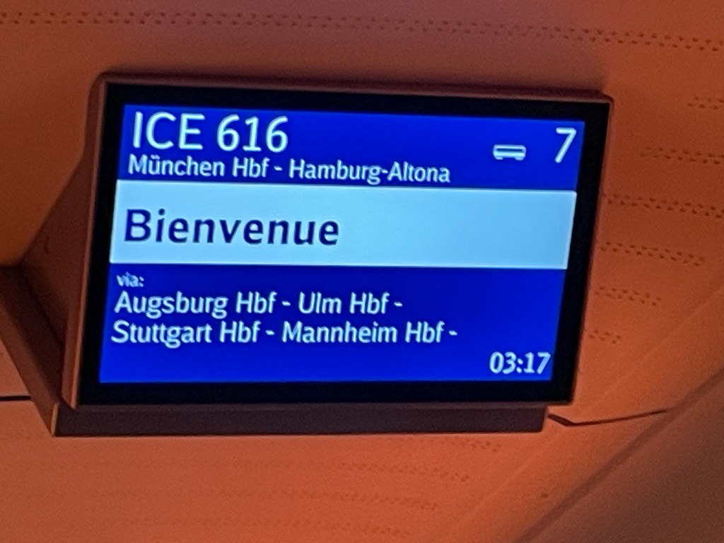 A week on and I can’t shake the journey home. The oddness of Munich Hauptbahnhof at 3am. It was not a very deserted place. I was expecting complete shutdown and acres of platform space to myself. The game finished late, and lots of people just kind of bimbled around, seemingly happy to wait for a train. They may have booked a late service thinking of extra time. Services to Ulm and Stuttgart are timetabled, and busy at 2.30 and 3.16am. Trains may not always be prompt in Germany but they do run all night. The 3.16, ICE616, is displayed as running to Munster (West) but in fact snakes its way across the whole country to Hamburg Altona. It’s a regular train, not a night service, so the only accommodation was a seat to curl up in.
