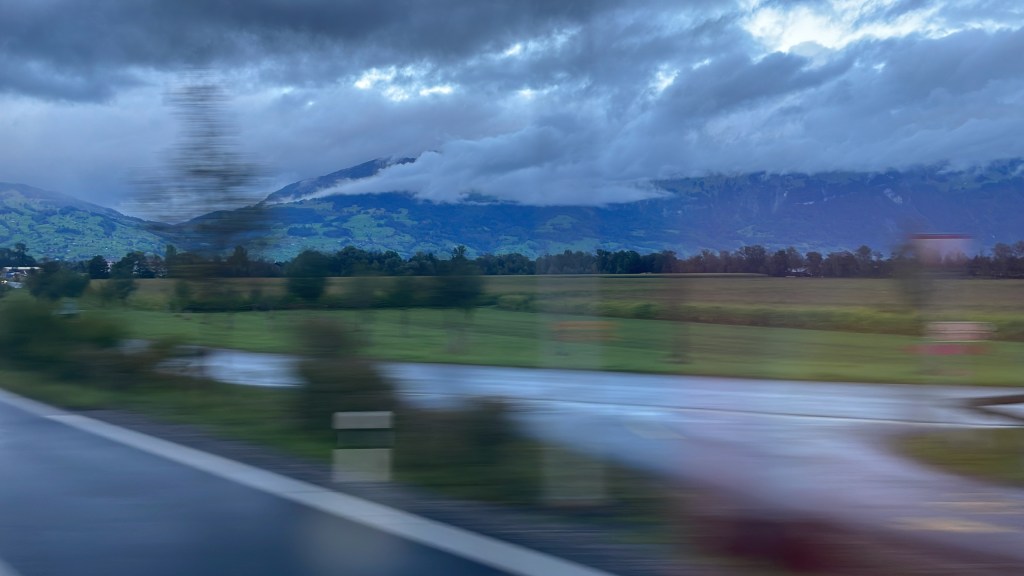 Along the way there was the odd glimpse of river, of the lake at Zell am See, occasional church towers and Alpine-style houses. No car headlights, a few passengers getting on and off. It was magic. I did doze off between around 4 and 7, waking with a jolt with an announcement at Feldkirch that was seemingly designed to stir all aboard for the 7-minute crossing of Liechtenstein. There was no loco change for crossing one of the world’s smallest countries. Does Liechtenstein even exist? The Alps sat for much of the early morning draped in cloud, with fangs of rock emerging from where the mist hadn’t sunk. Sort of Autumn, or just a continuation of the soggy summer that’s been everywhere. The Swiss frontier was both more of the same and a suggestion of the effortless efficiency that takes over when you’re on a train there.