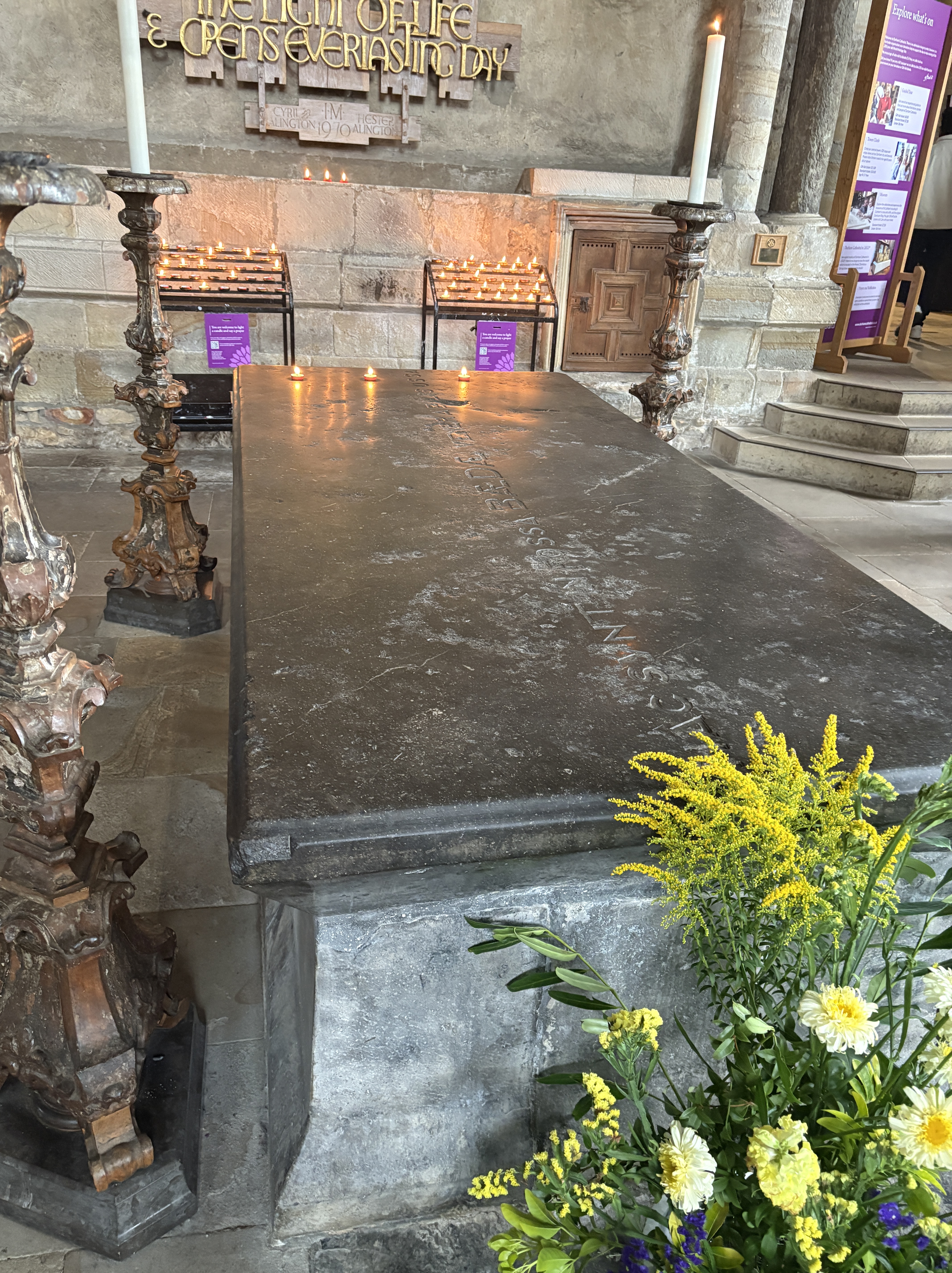Is in ðere byri eac bearnum gecyðed ðe arfesta eadig Cudberch and ðes clene cyninges heafud, Osuualdes, Engle leo, and Aidan biscop, Eadberch and Eadfrið, æðele geferes. Is ðer inne midd heom Æðelwold biscop and breoma bocera Beda, and Boisil abbot, ðe clene Cudberte on gecheðe lerde lustum, and he his lara wel genom.