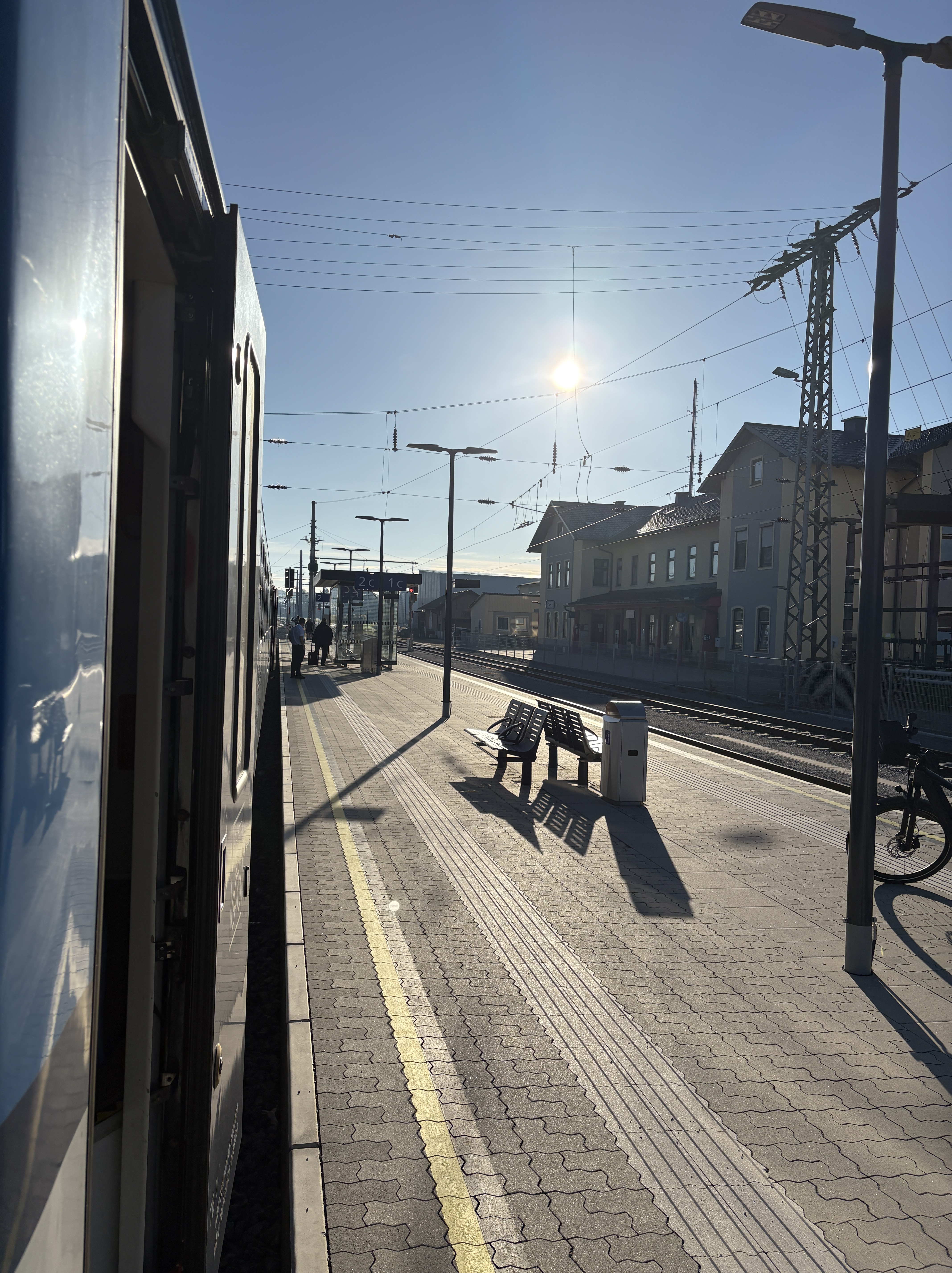 Crossing Slovenia and Austria, adding and removing locos and car-carrying wagons with frequent long pauses wasn’t a recipe for a smooth night’s sleep, or very much sleep at all. I didn’t mind too much and enjoyed strolling deserted platforms in the dead of night. At Villach a kind of NIghtjet party, with Italy, Germany and Vienna-bound services congregating for a conga of shunting and loud chat between Austrian Railways staff.